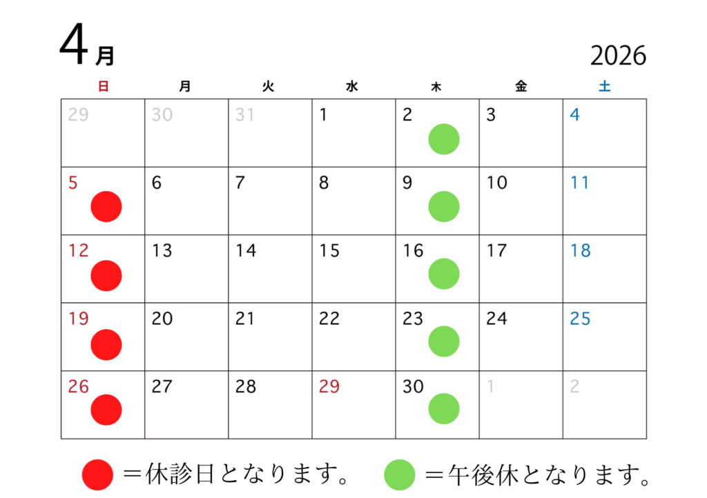 2026/4月の休診日です。よろしくお願いいたします。